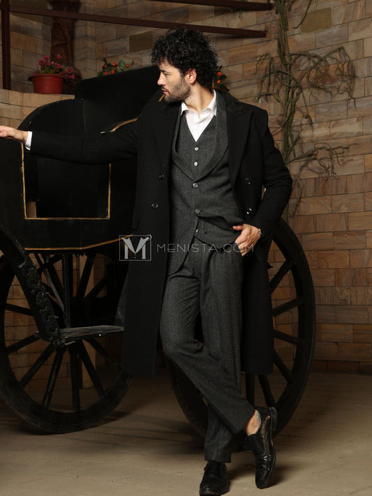 Menista Handmade Premium Black Wool Long Trench Coat for Men – Perfect for Winter, Business, and Casual Wear; Ideal Gift for Him