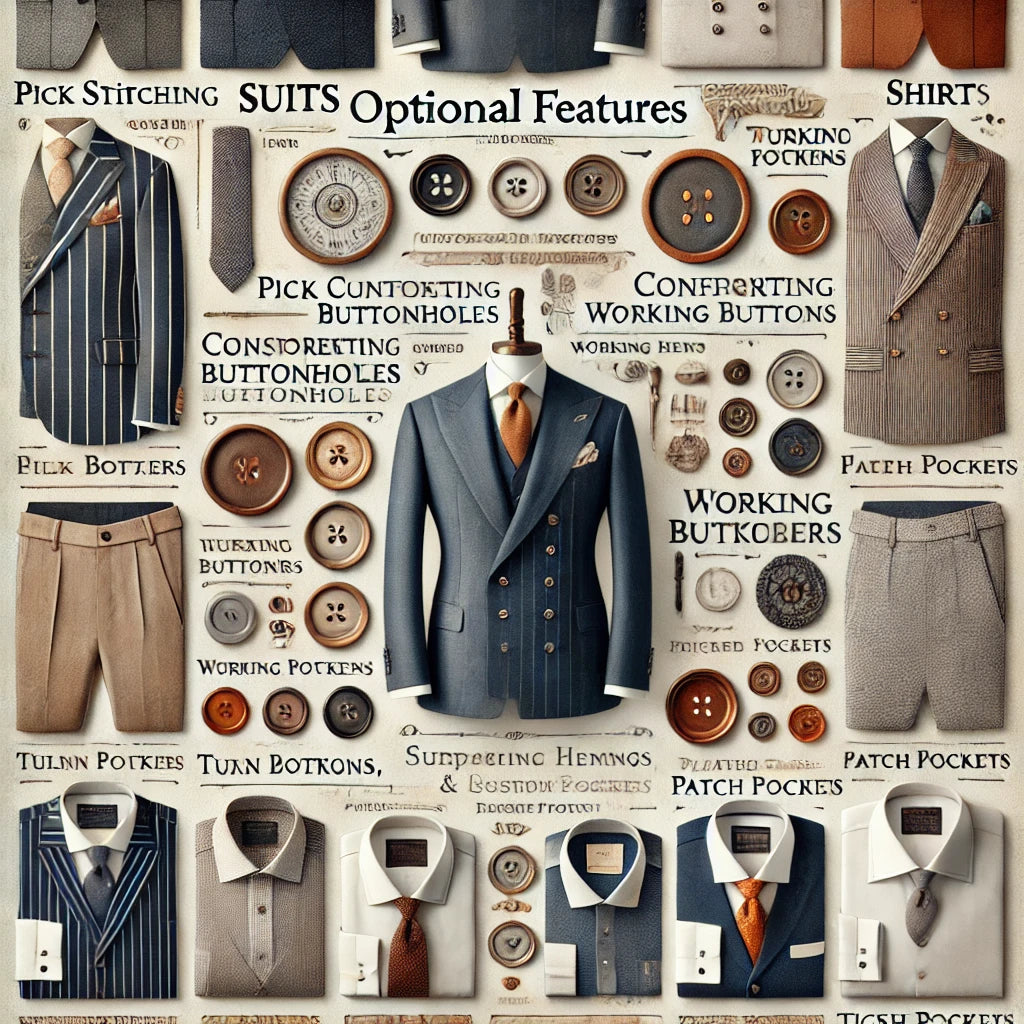 - Shirts: cufflinks, custom buttons, embroidery, pintex, different collar style etc.