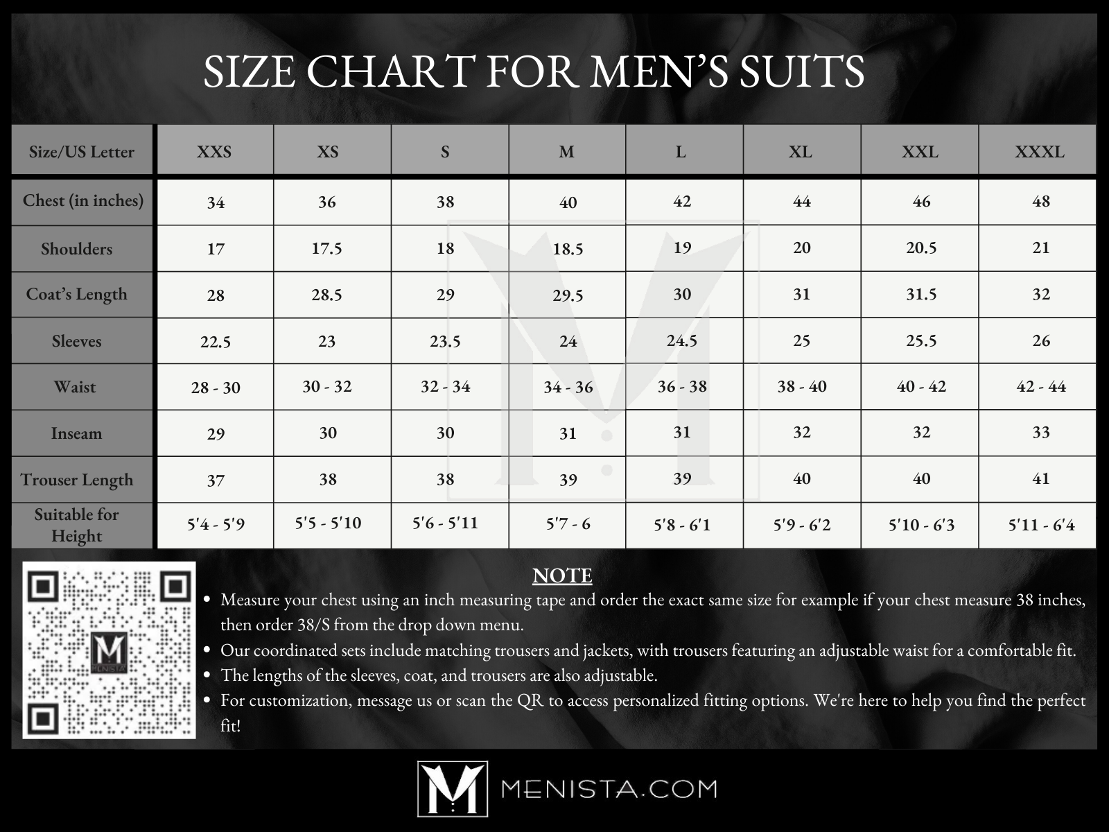 At Menista, we believe that a well-fitting suit enhances confidence and style. Use our comprehensive size guide to ensure your suit fits perfectly, highlighting your best features.
